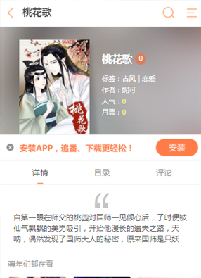 简介:漫画《桃花歌》讲述了自第一眼在师父的桃园对国师一见倾心后,子时便被仙气飘飘的美男吸引,开始他漫长的追夫之路,天呐,偶然发现了国师大人的秘密,原来国师是只妖。