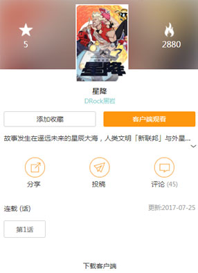 简介:《星降》漫画讲述:在人类的未来,已经发展新纪元的年代,人类文明和外星文明是宇宙中的两大敌对势力,为了遥远星球中的各路资源补给,战争纷乱从未听过,而救世主就此降生【